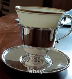 This Ovington pattern has no number. The only other sterling pieces in this brand were 3... One is a demitasse set with a different patten, a sugar tong and a coffee pot and tea pot. You can find many pieces of China, but sterling is rare. Each cup and saucer without the insert weighs 56.6 grams (2 ounces), a little more than half pound of sterling for the 8.