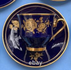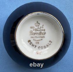 We are pleased to offer this beautiful coffee set produced by Bareuther of Bavaria in an Echt Cobalt pattern with cobalt background, gold floral decorations, and gold trim (pattern BTH 90). This set consists of a covered coffeepot (8 ½ inches tall), creamer, covered sugar bowl, 12 demitasse cups (2 3/8 inches tall), and 12 demitasse saucers (4 5/8 inches). All pieces are in excellent condition with no chips or cracks, except one cup has a 1/8-inch chip at the rim. It appears to have seen little, if any, use. The pieces are marked Bareuther Waldsassen Bavaria Echt Cobalt.