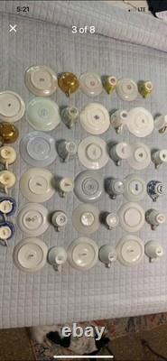 Sets of demitasse cups and saucers with display shelves, featuring a painted design in multicolor porcelain. The set includes cups and saucers from various high-end brands such as Arita, Limoges, Royal Doulton & Co, Tiffany & Co. Antique in nature, this original set is perfect for collectors or for adding a touch of elegance to any kitchen or dining room.